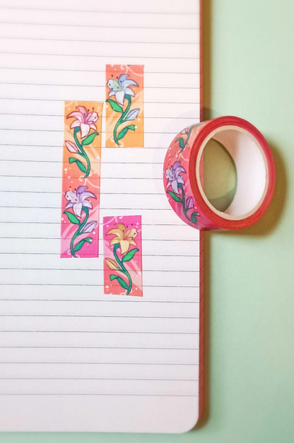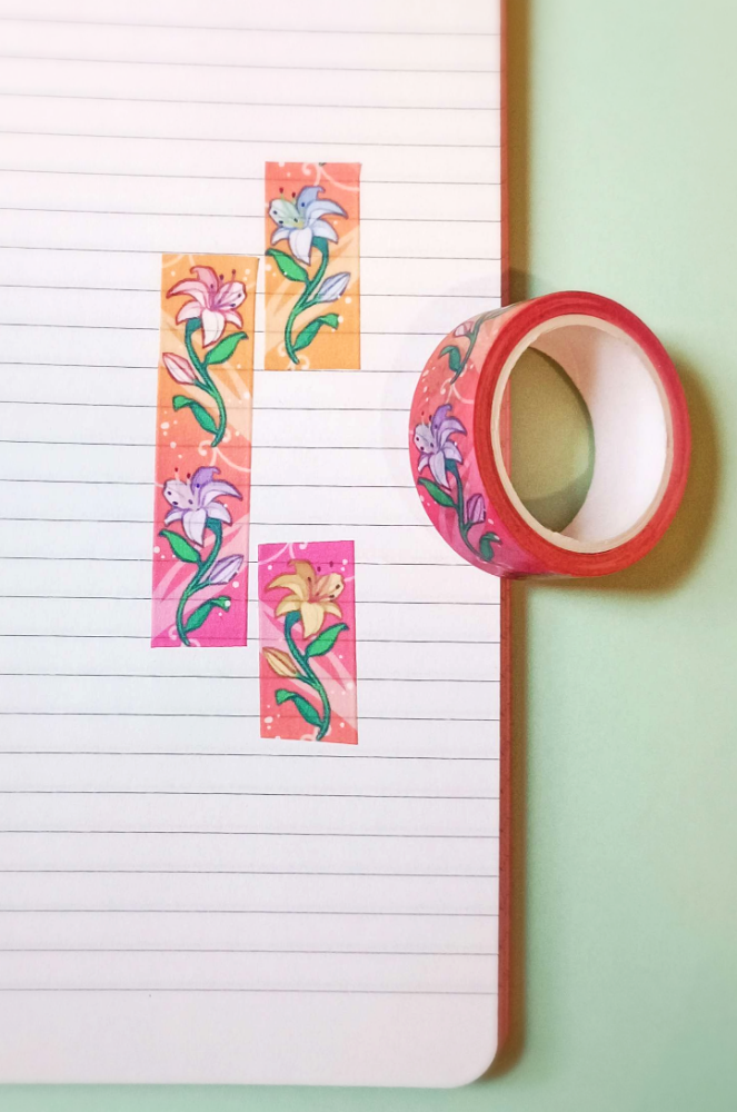 The tape comes in the following designs: Lily (Pink-Yellow), Daytime Rose (Green-Cyan), Dusk Rose (Cyan-Blue), and Peony (Dark blue-Purple).